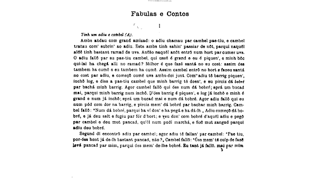 A história que segue em anexo – “Adiu e Cambel”- é contada em Damão. Pois aqui encontramos uma pertinente relação entre elas: o fundamento moral e social é o mesmo. A amizade, a amizade interessada, a esperteza, o logro, a intrujice, o abuso de coisa alheia, a consequência, a resposta inteligente, a ironia que é uma caraterística dos textos crioulos.